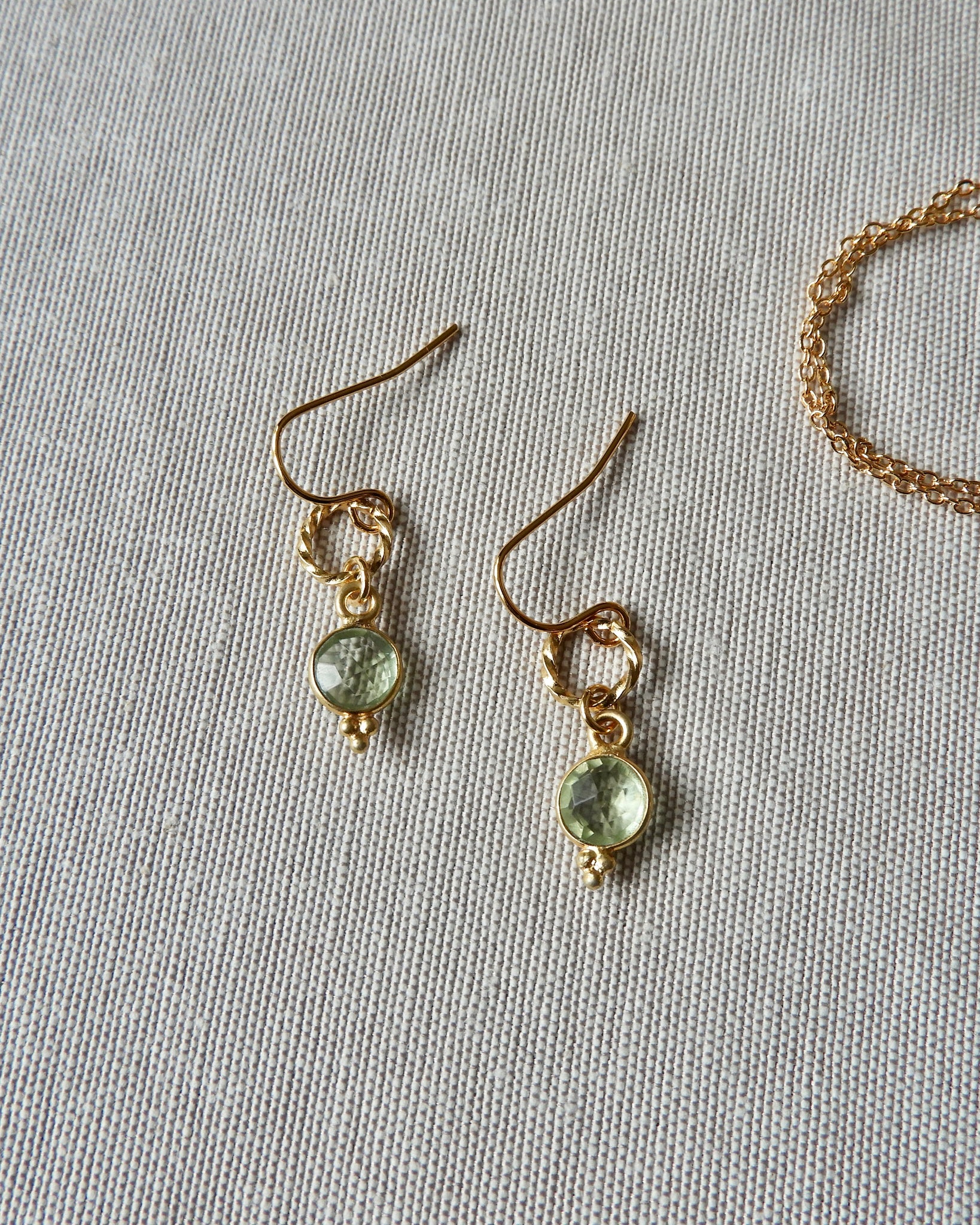 Paire de boucles d'oreilles retenant chacune un cercle torsadé et une pierre verte.