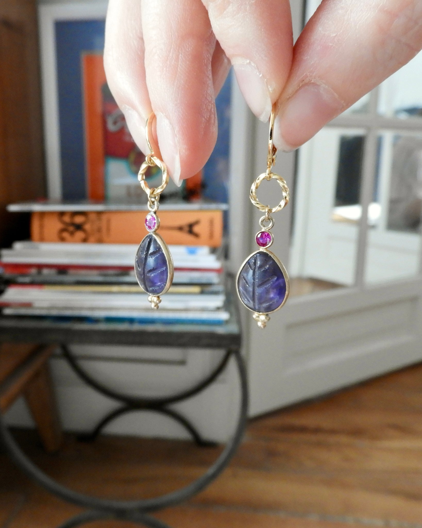 Paire de boucles d'oreilles retenant chacune un cercle torsadé, une petite pierre facettée rose et une améthyste gravée, en forme de goutte.