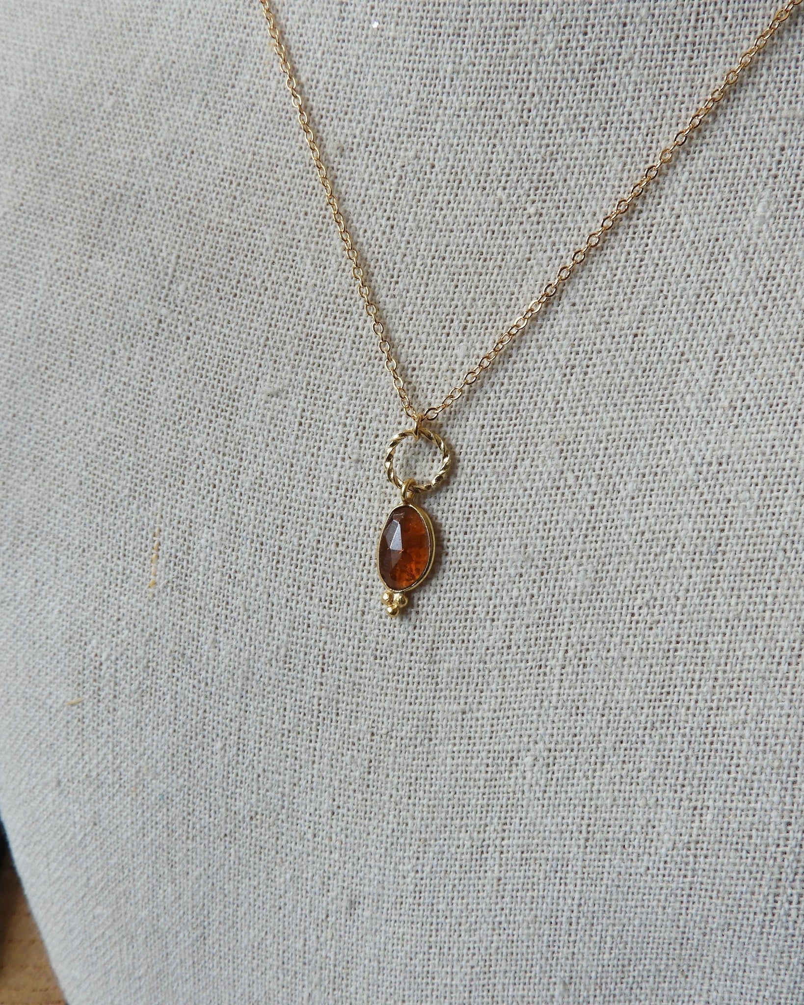 Fine chaîne retenant en pendentif un cercle torsadé et un grenat orangé.