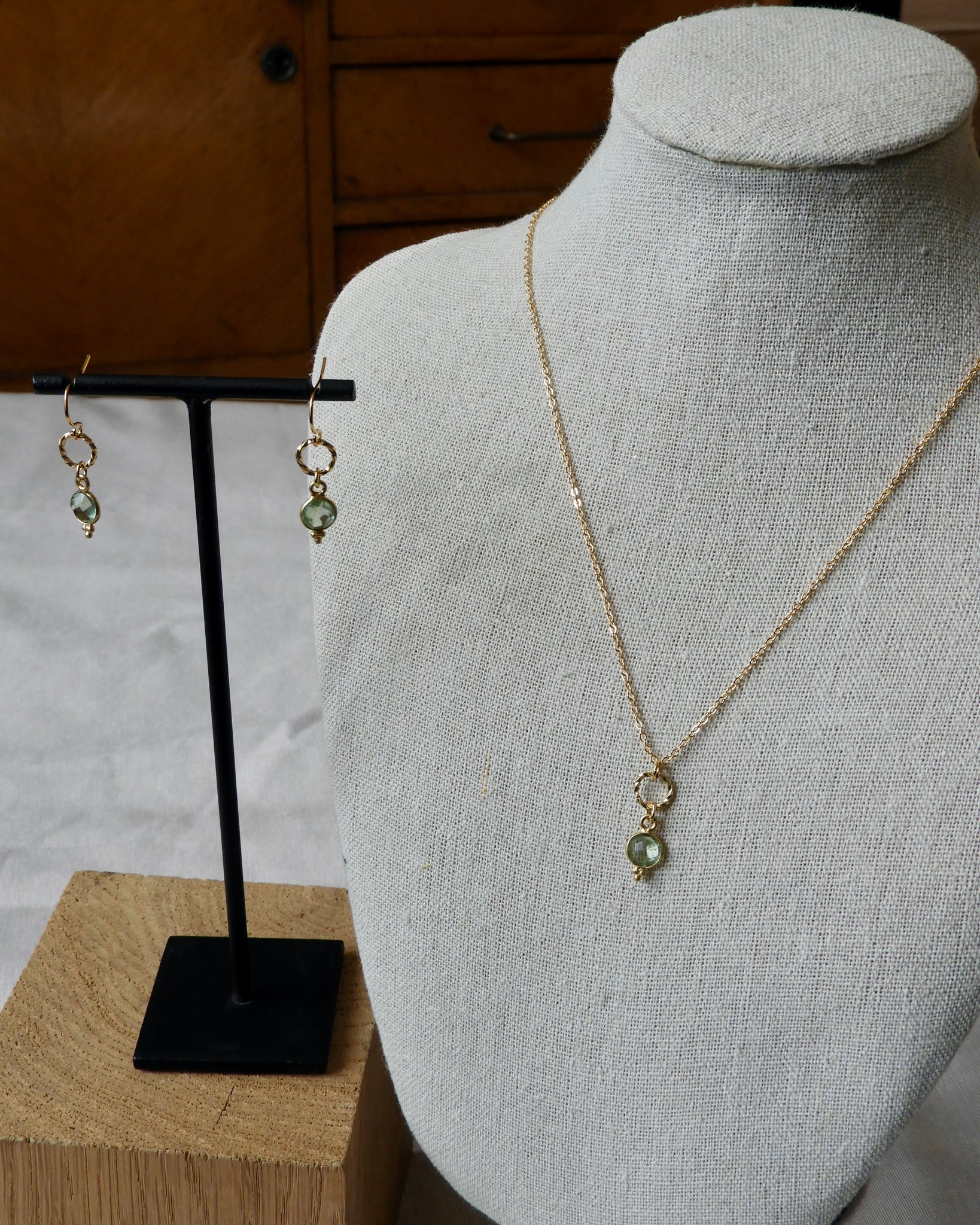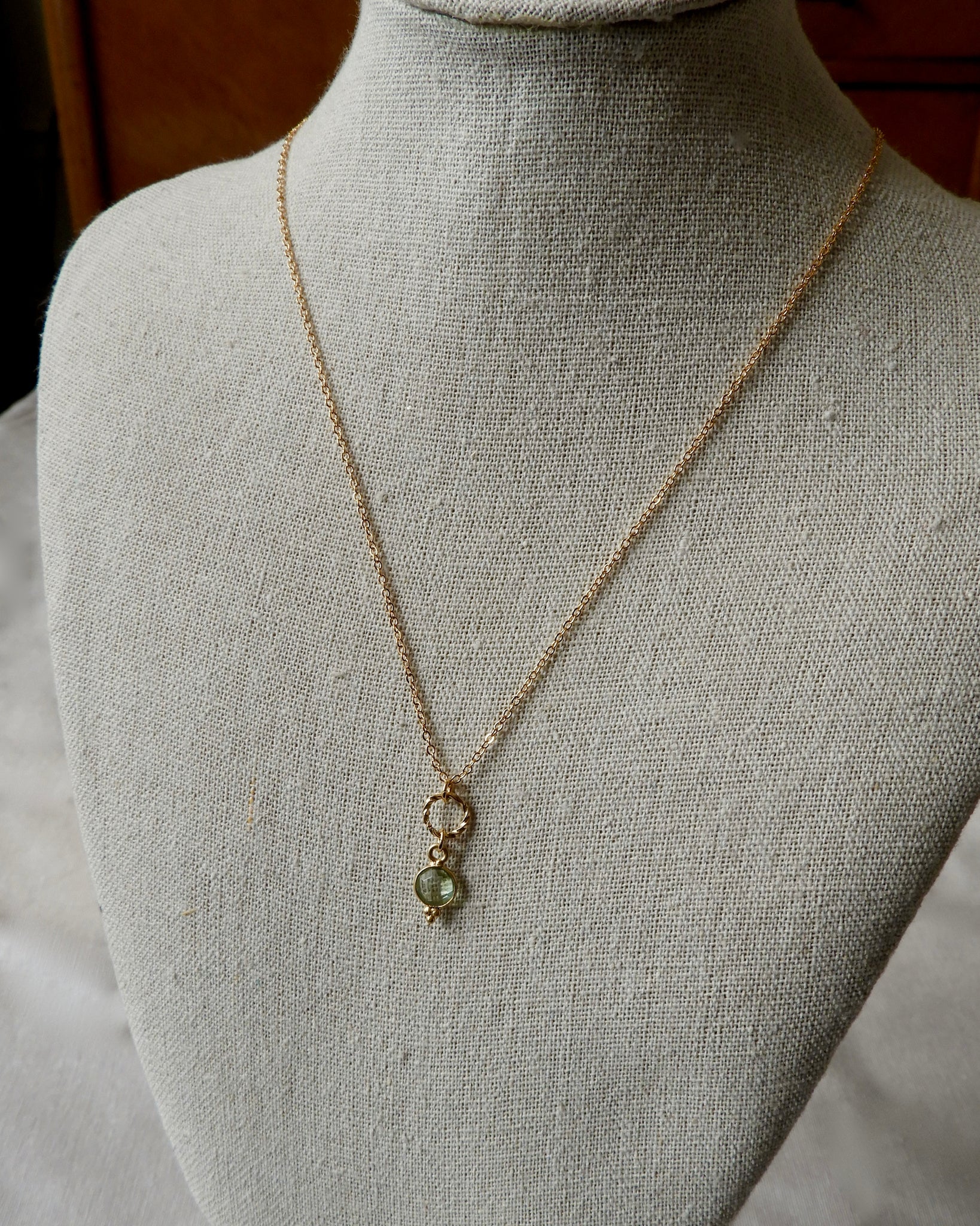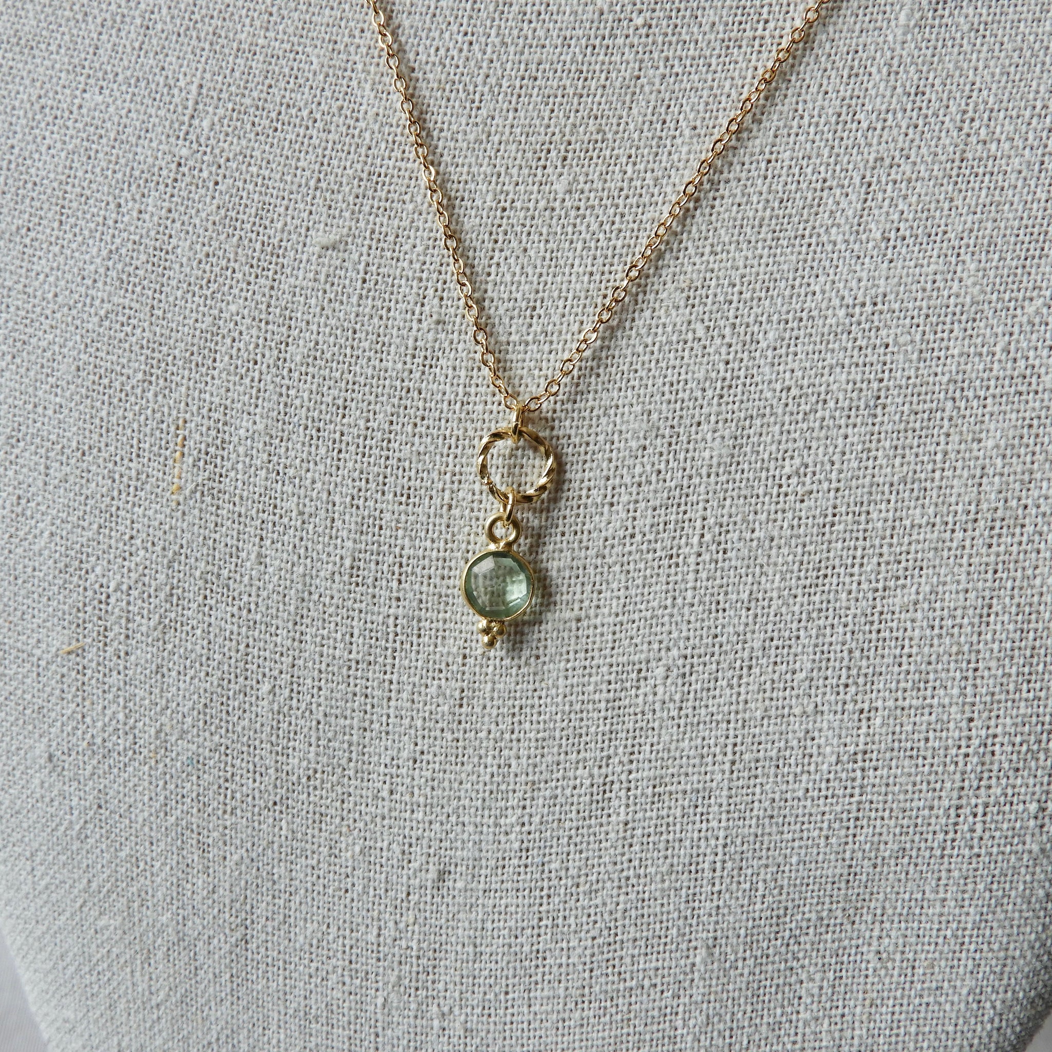 Fine chaîne retenant en pendentif un cercle torsadé et une pierre verte ronde.