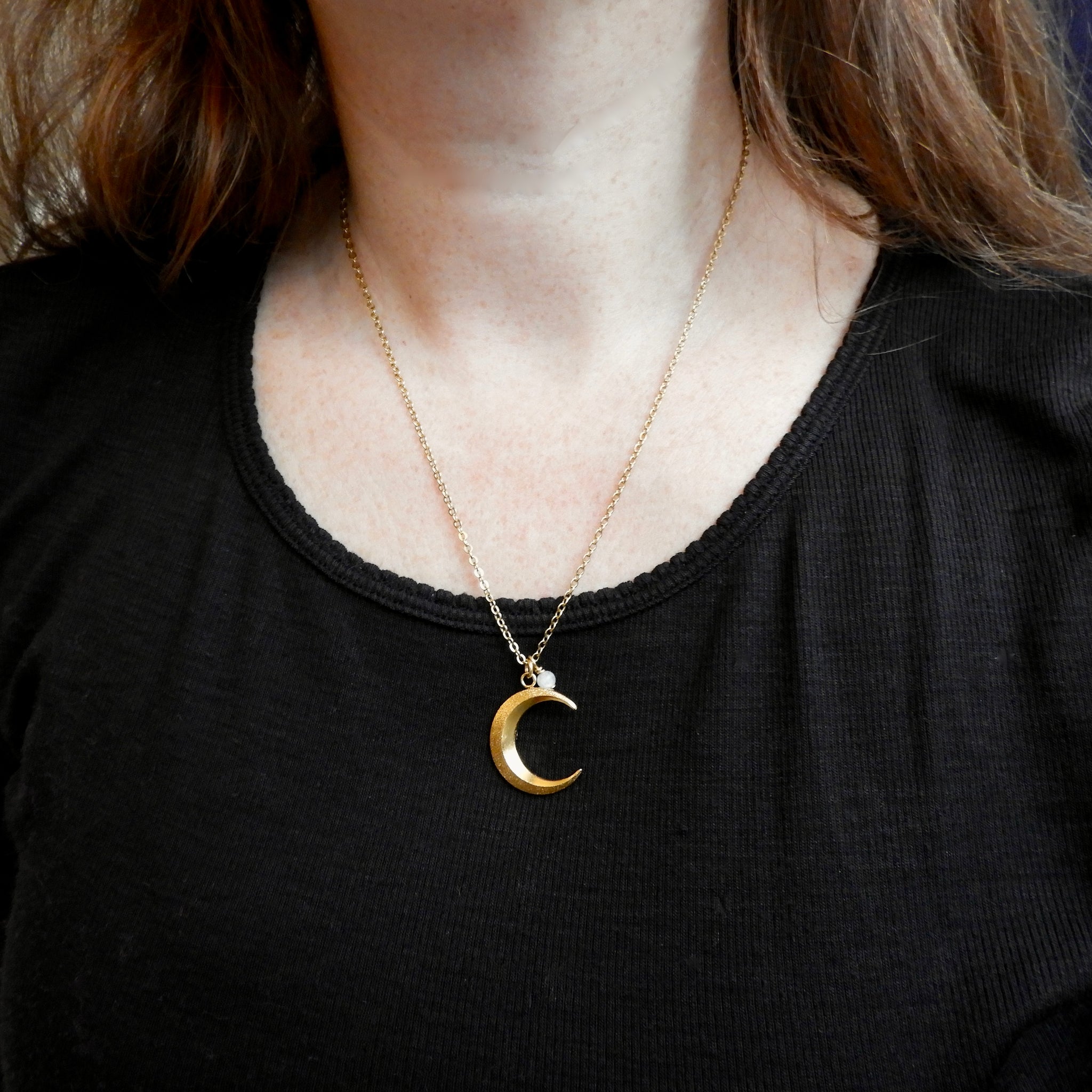 Pendentif croissant de Lune texturé sur un côté et perle en pierre de Lune en breloque, sur une chaîne maille forçat.