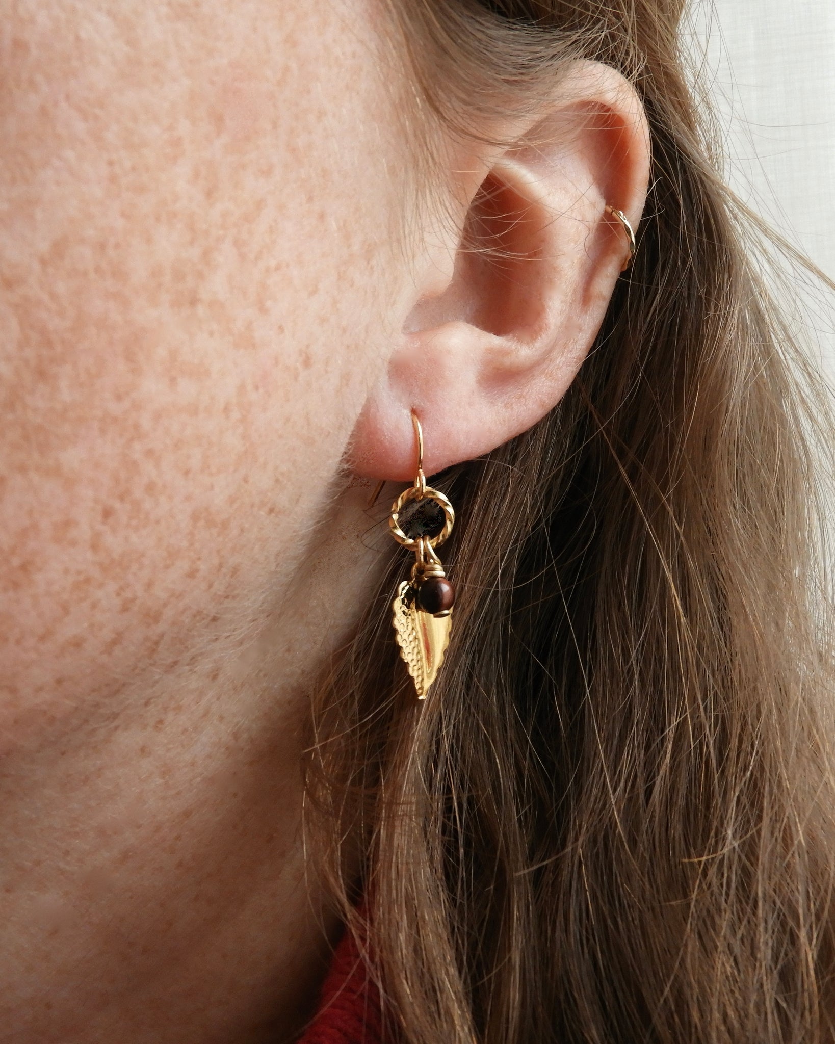 Paire de pendants d'oreilles retenant chacun une petite feuille et une perle en œil de taureau en breloque.