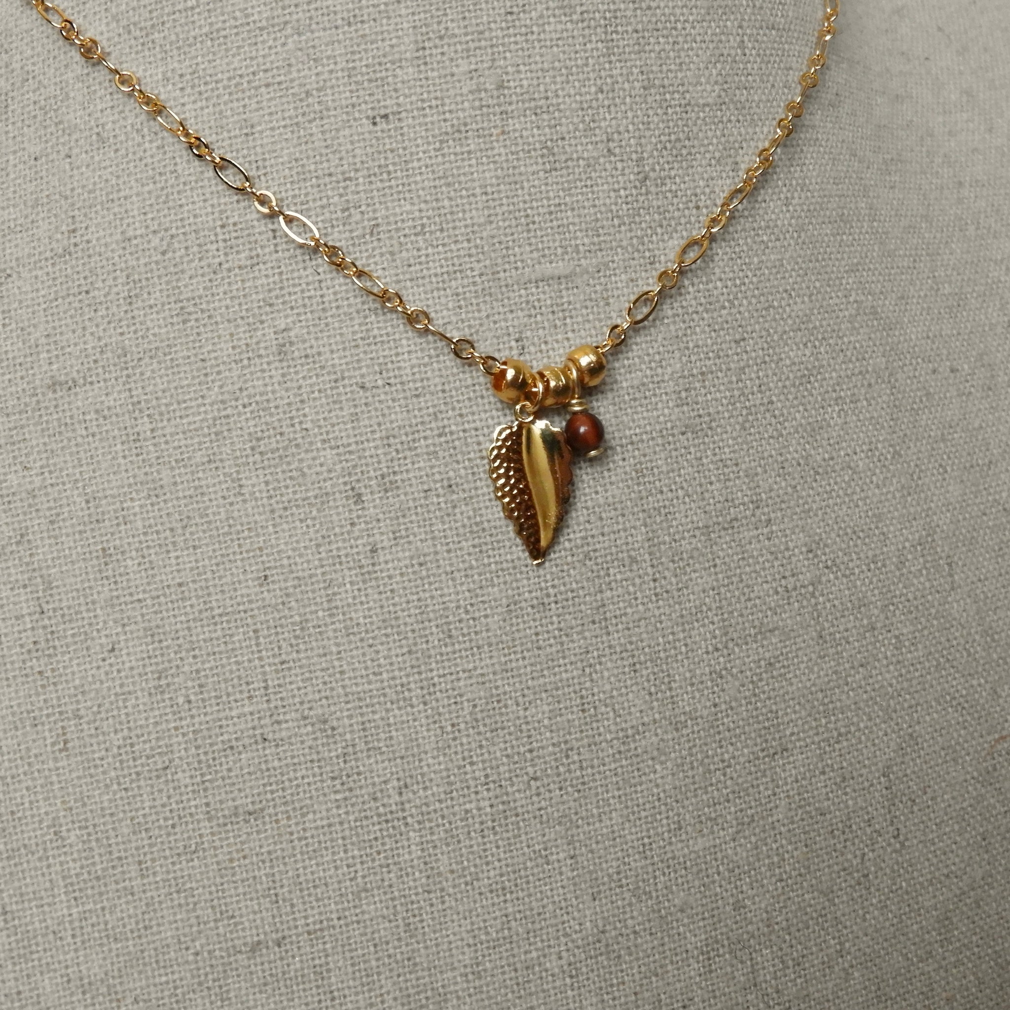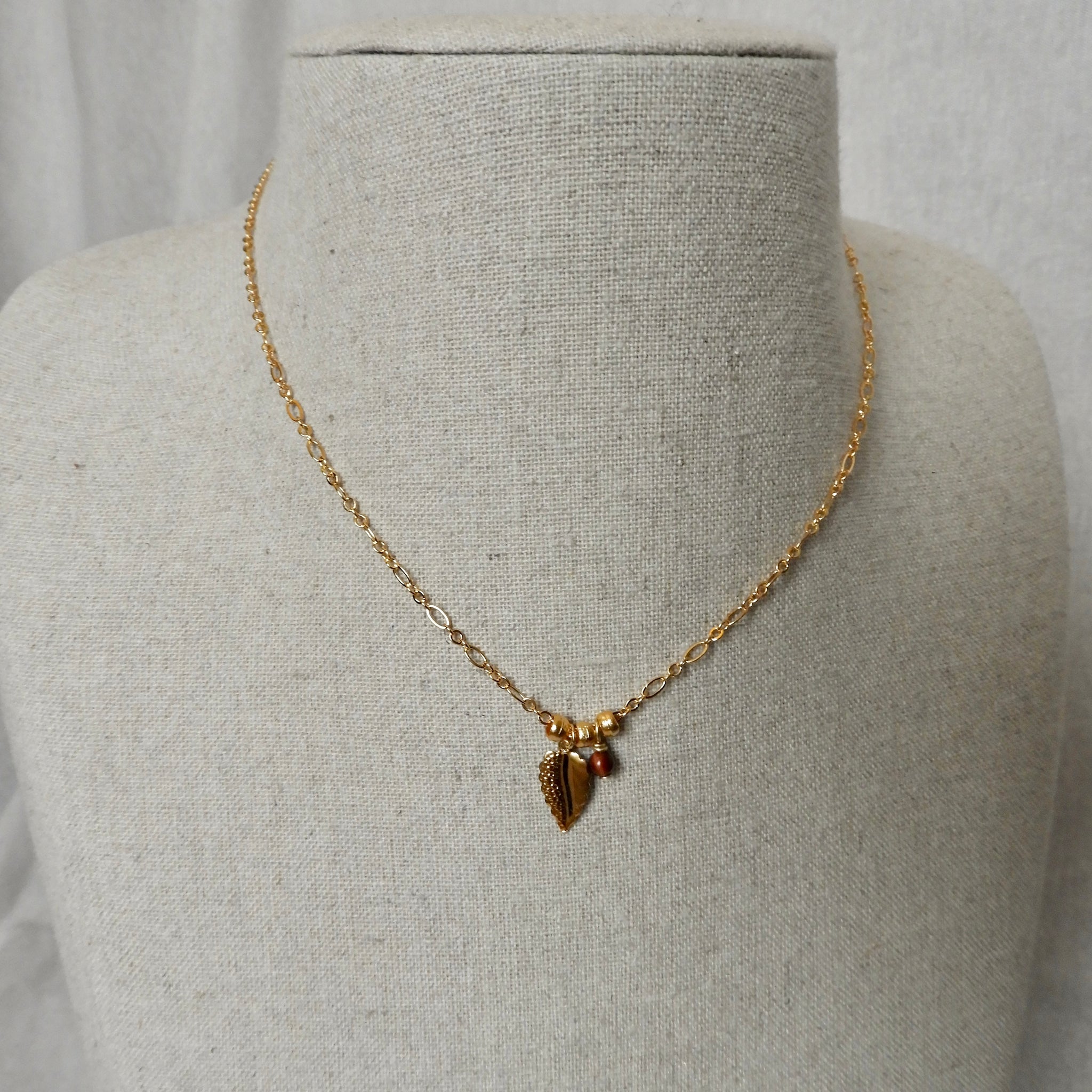 Petit pendentif au motif de feuille et perle en œil de taureau en breloque, sur un chaîne maille fantaisie en laiton doré à l'or fin 24K.