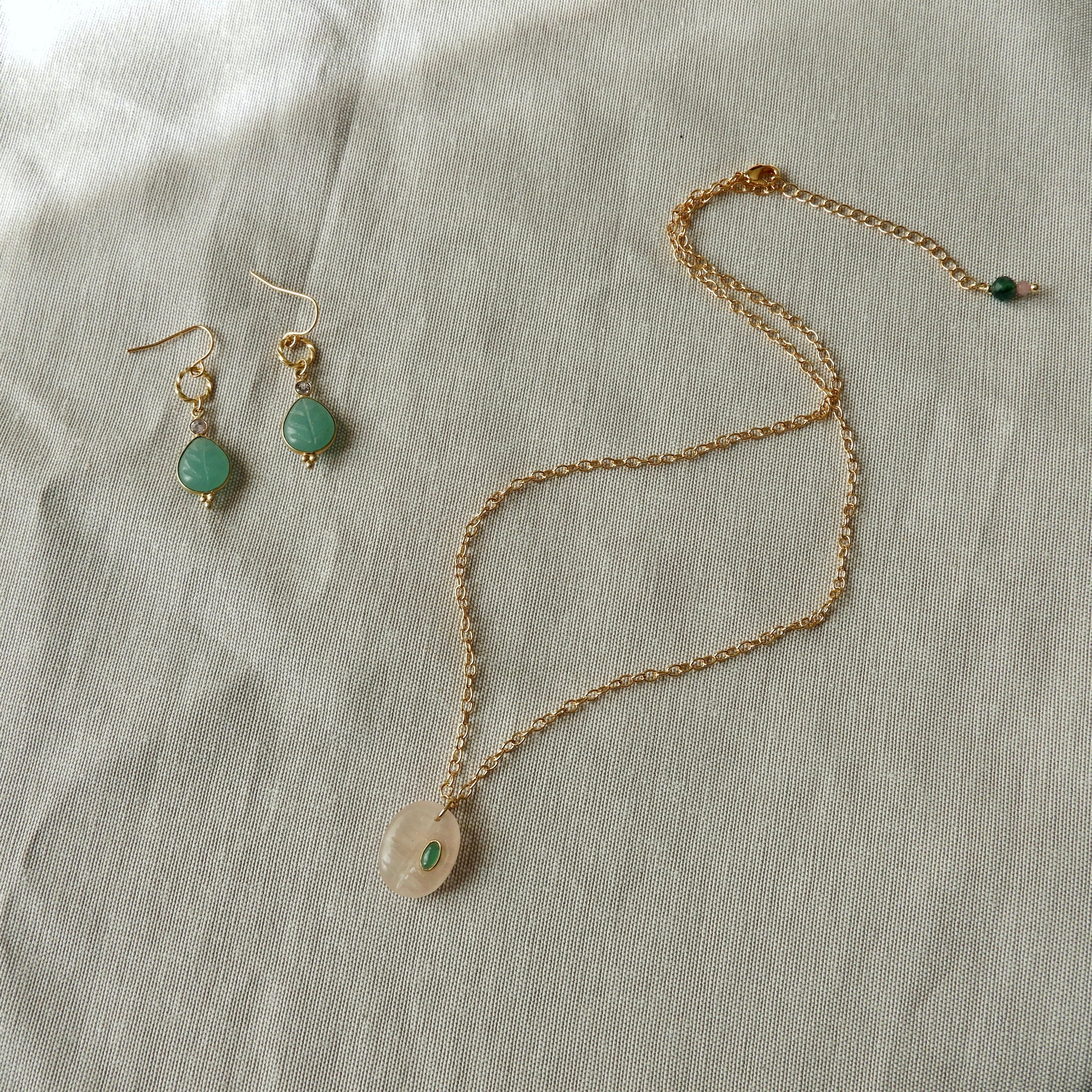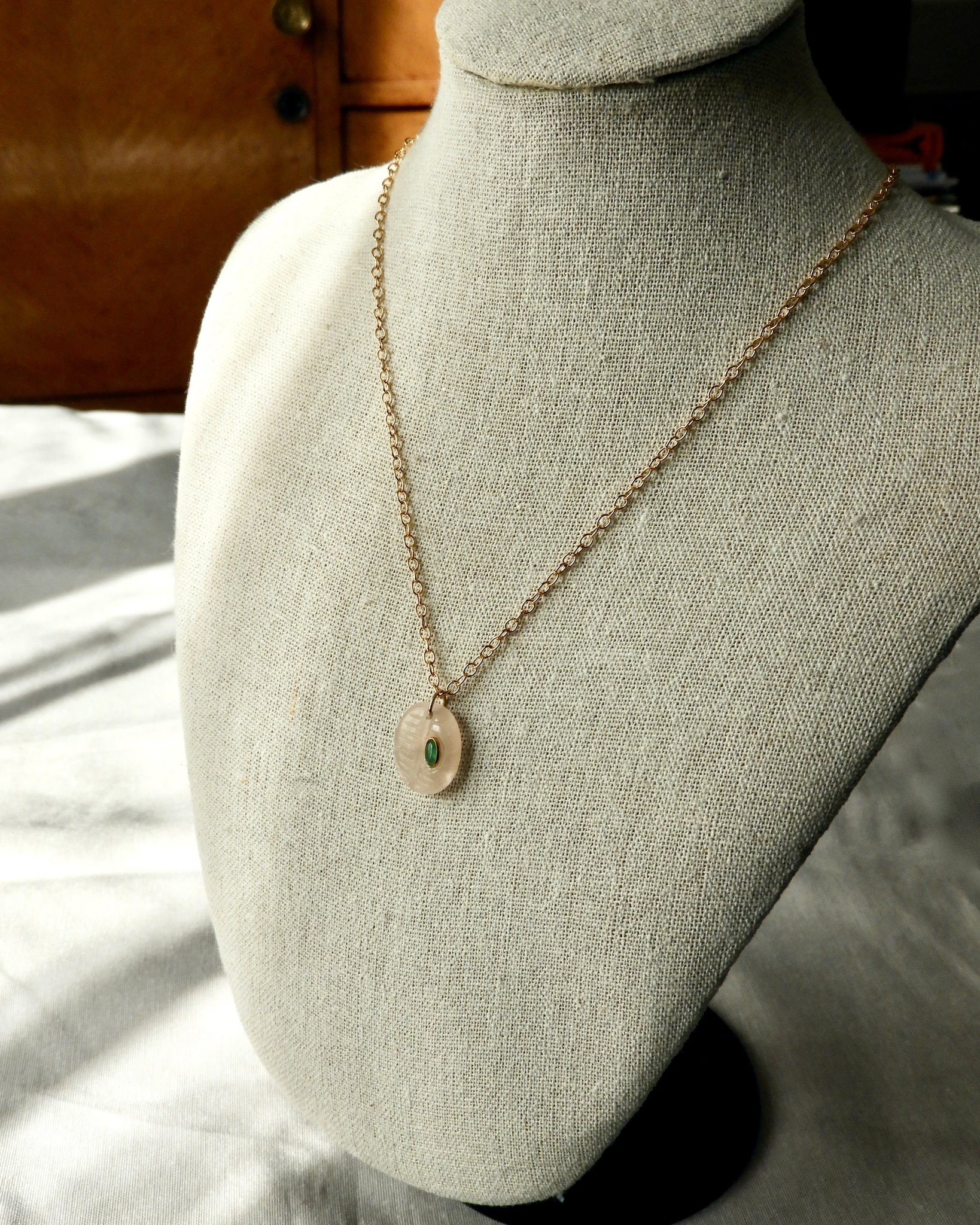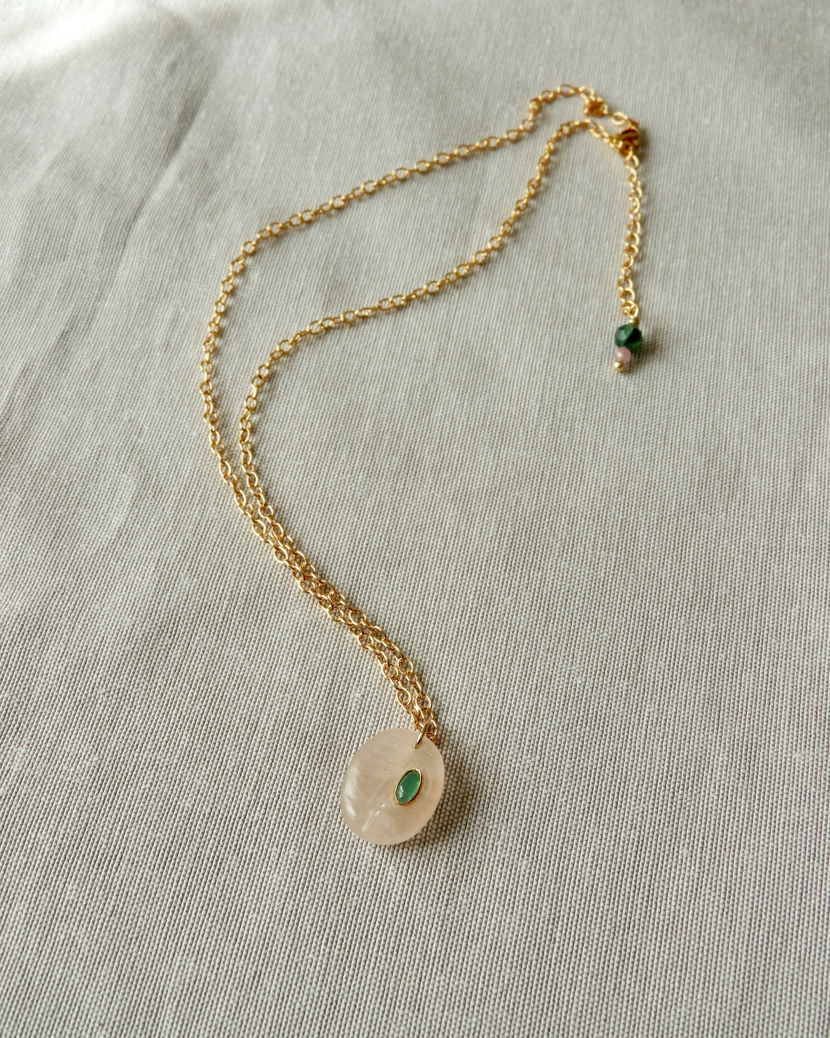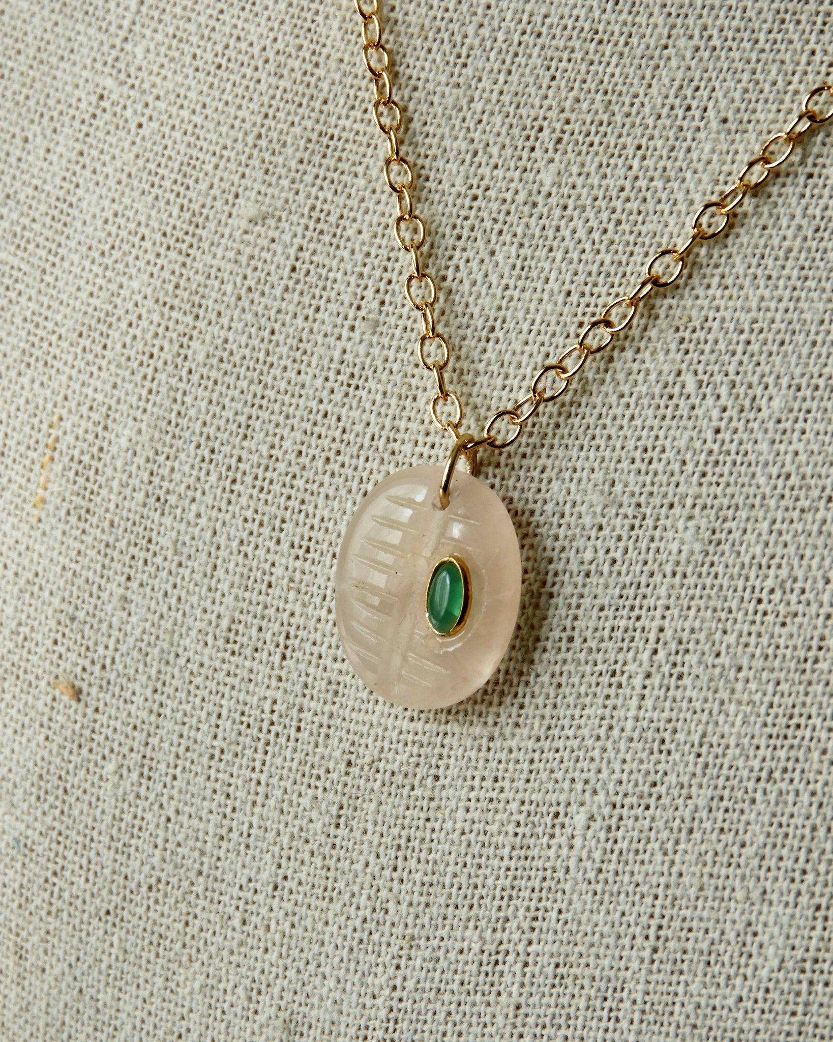 Pendentif en calcédoine rose sculpté et gravé en forme de grain de café avec un insert en pierre verte sur une chaîne maille ovale.